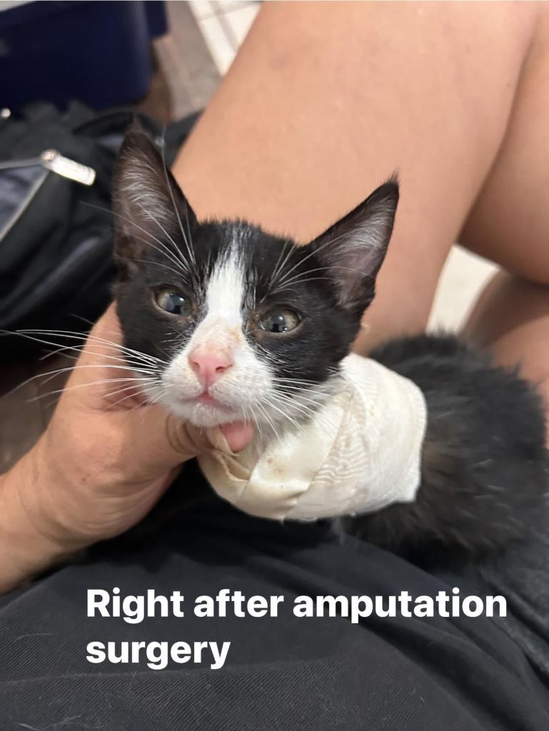 He came to us at approximately 2 months old. He was severely injured and had to have his leg amputated. This has not slowed him down at all.